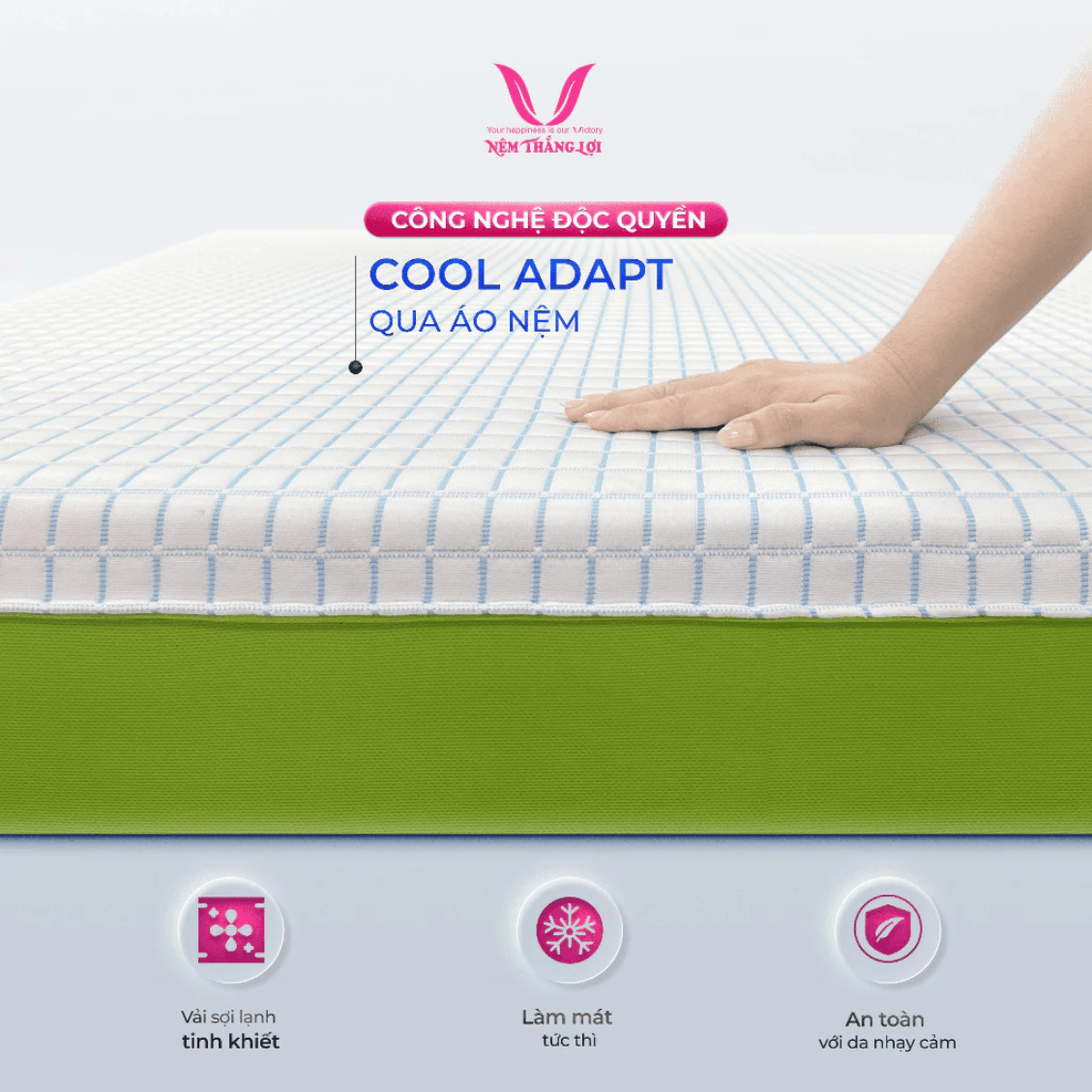 Giấc ngủ chất lượng không chỉ giúp cơ thể phục hồi mà còn quyết định năng lượng, tinh thần và sức khỏe tổng thể mỗi ngày. Hiểu được điều đó, Thắng Lợi mang đến sản phẩm nệm mới – Nệm Cao Su Thiên Nhiên Điều Hòa Hybrid Matcha Cool, chiếc nệm được thiết kế giải quyết nhiều vấn đề giấc ngủ cho người Việt.